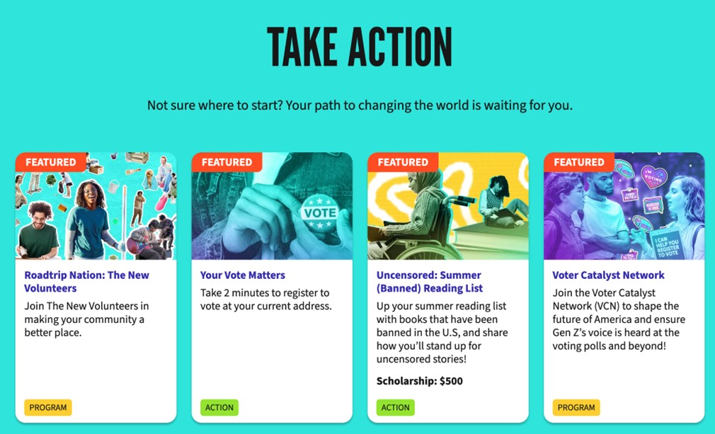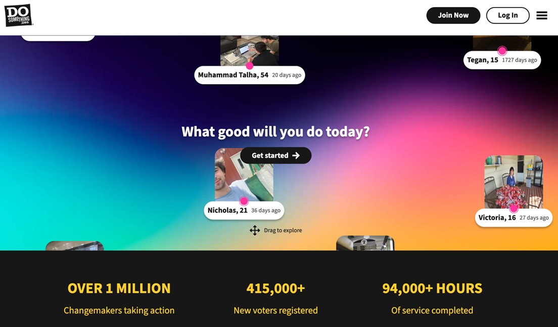다양한 캠페인과 기회를 통해 DoSomething 회원은 자원 봉사의 참여 기회를 얻는데 다양한 참여 기회를 통해 청소년이 아닌 사회 구성원의 여정을 시작할 수 있고, 지역 사회에 긍정적인 영향을 미치며, 그들이 보고 싶은 미래를 만들어가는데 직접 참여할 수 있도록 한다.