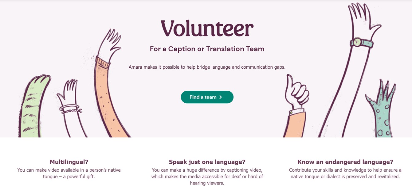 Amara는 자원봉사자들을 통해 다양한 언어로 자막 작업을 진행한다. Amara에 자원봉사자로 참여하면, 자막 작업을 통해 전 세계 사람들이 비디오 콘텐츠에 접근할 수 있도록 돕는 활동에 기여할 수 있다. 자원봉사자는 Amara Community에 가입해 다양한 프로젝트에 참여하게 된다. 자원봉사 활동은 Amara의 미션인 정보 접근성 확대에 기여하는 뜻깊은 기회이다. Amara는 자막 작업 외에도 언어 보존 및 부흥 프로젝트를 운영하고 있다. 소수 언어나 소멸 위기의 언어를 기록하고 번역하는 프로젝트에 참여해, 언어와 문화 보존에 기여할 수 있다. 이는 언어학이나 문화에 관심 있는 청년들에게 매우 의미 있는 활동이 될 수 있다.